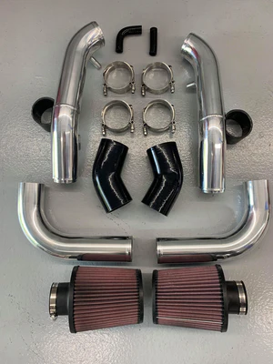 These intakes are fabricated and tig welded in house using 6061 aluminum tubing and designed to achieve maximum performance. The 69 mm diameter was chosen due to the fact that the OEM throttle body opening is very similar in size thus creating maximum airflow and the least amount of pressure differential going into the engine.